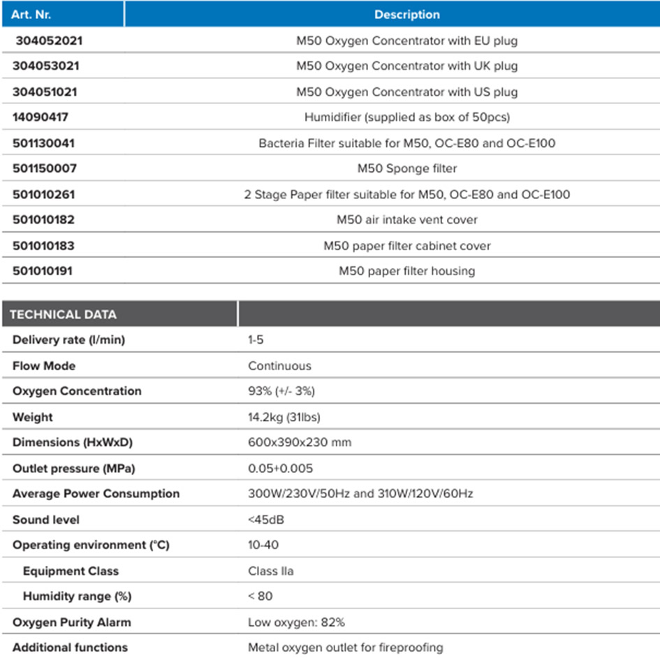 The lightweight, ergonomically designed M50 oxygen concentrator makes life simpler for patients that require Long Term oxygen Therapy (LTOT). The M50 delivers high concentration of oxygen with flow rates of up to 5 litres per minute. Featuring a compact design, the M50 is easy to move, store and maintain - with just one minute needed to replace any part to be maintained by the user. It also comes with an integrated oxygen sensing device for monitoring oxygen purity levels, and a low oxygen purity alarm to alert the patient if there is low oxygen supply.